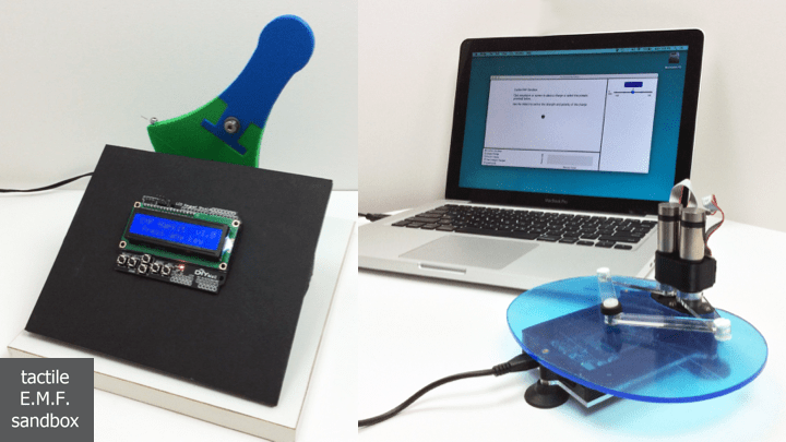 As part of the Student Innovation Challenge for the World Haptics 2017 conference, myself and two others built two devices to help teach students about electromagnetics. The EMF Hapkit helps to teach force-distance relationships, and the EMF Sandbox helps to teach electrostatics in multi-charge configurations.